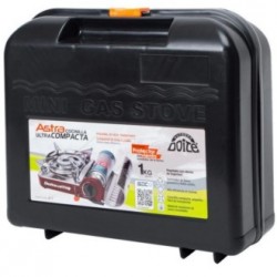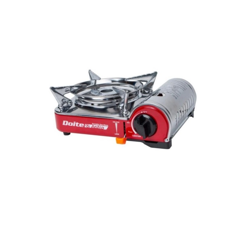 Cocinilla de sobremesa compacta y liviana hecha de acero inoxidable. Tiene un regulador con válvula de seguridad, un quemador de llama giratoria y doble salida, lo cual brinda mayor eficiencia al cocinar. Este modelo viene con una maleta de transporte. Además incluye 4 unidades de gas. Peso: 1 kg.